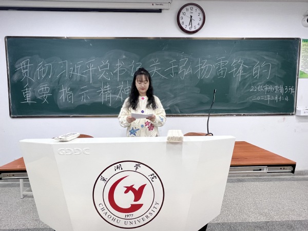 首先,胡书怡介绍了本次会议的流程和内容。她给同学们介绍雷锋同志的生平,讲述了雷锋同志的经历,让同学们更加深刻的了解雷锋精神。接着,她说道雷锋精神是服务人民、助人为乐的奉献精神;干一行爱一行、专一行精一行的敬业精神;锐意进取、自强不息的创新精神;艰苦奋斗、勤俭节约的创业精神。让同学们要向雷锋同志学习,不管是在工作中还是学习中都要保持积极向上的心态和乐于助人的美好品质。随后,胡书怡带领同学们学习习近平总书记关于弘扬雷锋精神的重要指示,她指出作为新一代的青年,要积极参与社会志愿实践活动中,将雷锋精神传承下去。最后,她对本次会议进行总结,鼓励同学们学习雷锋同志全心全意为人民服务的精神和坚韧不拔的意志,积极乐观,勇于面对挑战,不畏艰难险阻,坚持不懈,即使在极端困难的时刻,也要勇于面对,绝不轻言放弃。