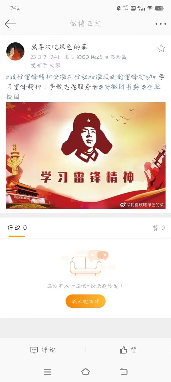 首先,刘明星在班级群里号召大家学习雷锋精神,并且表示雷锋精神是以雷锋同志的名字命名,以雷锋的精神为基本内涵,是在实践中不断丰富和发展着的革命精神。随后,她组织大家通过微博发布带有“徽风皖韵雷锋行”等话题的方式来弘扬雷锋精神,并指出在新征程上,要深刻把握雷锋精神的时代内涵,加强志愿服务保障和支持,不断发展壮大学雷锋志愿服务队伍,让学雷锋在班级中蔚然成风。最后,大家通过发布学习雷锋精神线上活动表示学雷锋,就要像雷锋一样,将奉献作为持之以恒的行动自觉。