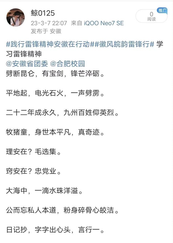 活动期间,同学们自主学习习近平总书记对深入开展学雷锋活动的重要指示,了解雷锋同志生平的感人事迹,通过微博平台分享学习雷锋的故事与志愿服务的照片,让雷锋精神在新时代绽放璀璨的光芒。