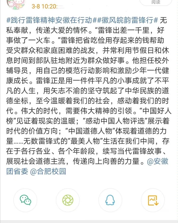 三月春风暖人心,雷锋精神永传承。为贯彻习近平总书记对深入开展学习雷锋活动作出的重要指示,弘扬雷锋精神,20级财务管理三班于3月8日开展“徽风皖韵雷锋行”主题活动。