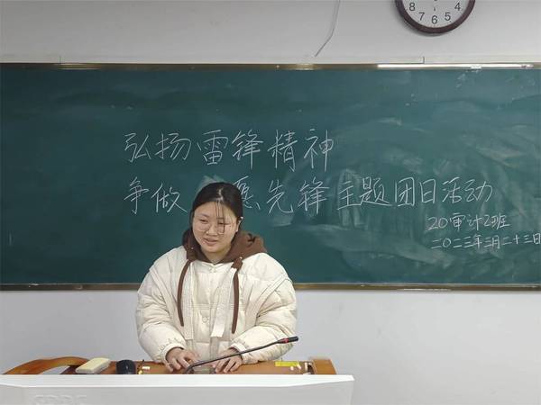 活动开始,施迁慧首先向各位同学简要介绍学雷锋纪念日,3月5日是学雷锋纪念日,雷锋精神是新中国成立以来一直鼓舞中国人祖祖辈辈的一种革命精神,深入贯彻了以爱国主义为核心的伟大民族精神,雷锋精神体现了一种向上、向善的人生姿态,纵观雷锋短暂的一生,他始终具有一种积极主动的生活态度,对新中国新生活充满无限热爱和美好向往,始终以饱满的热情和充足的干劲投入到工作学习之中去,当前,新时代新征程需要我们发扬雷锋精神,需要学习雷锋精神这种乐观向上,积极作为的人生姿态。随后,施迁慧就本次团日活动进行说明,本次团日活动分为两个子活动,第一个是徽风皖韵雷锋行,由班级同学积极参与分享雷锋故事,晒出志愿活动、公益场景等内容,并在微博上进行发表,第二个是学习雷锋事迹,领悟雷锋精神,带领同学观看雷锋事迹影视作品,开展相关主题班会。最后,施迁慧强调到,雷锋精神是新时代社会主义精神之一,是当代青年的指导思想之一,我们要积极继承并弘扬雷锋精神内核并加以实践。本次团日活动到此结束。