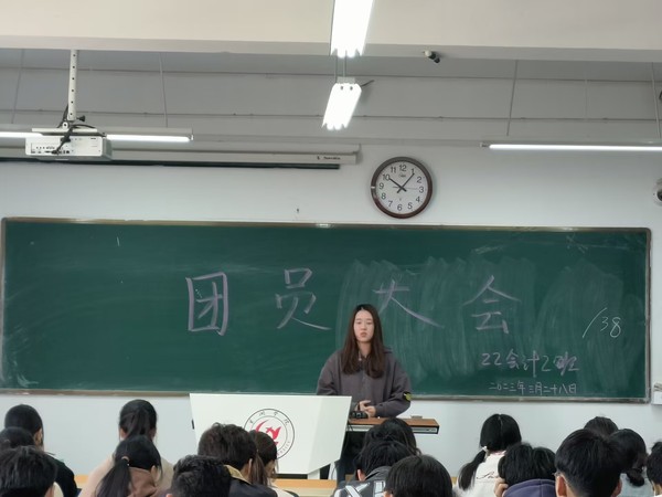 为评选入党积极分子,加强班团组织向心力和凝聚力,22会计二班于3月28日上午于博学楼316教室召开团员大会。此次会议由22会计二班团支书王凯主持,辅导员李梦雨老师出席,全体团员参加。