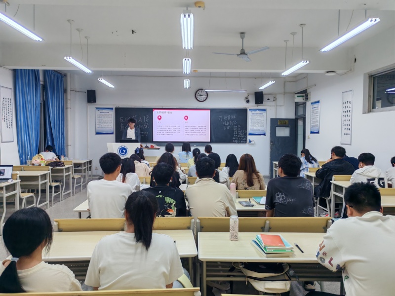 活动伊始,潘欣介绍此次团日的活动主题与意义,号召同学们以实际行动践行五四精神。随后开展三项子活动。第一项子活动为“诗颂五四情,笔绘青春志”。前期征集的优秀海报与诗歌作品在现场展示。海报以鲜明的色彩和创意构图,生动展现五四青年的热血担当;诗歌作品则以细腻笔触书写青年与时代同频的心声。同学们深情朗读原创诗歌,展现新时代青年的奋斗风采与国家情怀。第二个子活动为“五四知竞答,青春音识曲”室内游园会。在党史知识竞答环节,设置“中国共青团成立时间”“二十大报告新发展理念”等题目。同学们随机抽取题目作答,现场气氛热烈,尤其在“党的一大召开地点”等问题上展开讨论,正确率超90%,展现出同学们扎实的理论知识储备;“红色旋律回响”环节,《东方红》《团结就是力量》等经典红歌片段循环播放。《歌唱祖国》的片段引发全场合唱。同学们在竞猜中深化对红色文化的认知,在音符中追溯革命岁月。第三个子活动为“光影映五四,青春向未来”。活动选取红色影片《建党伟业》中相关经典片段进行展播。影片生动再现了百年前青年学子振臂高呼“外争主权,内除国贼”的热血场景,以及革命先驱在动荡时局中探寻救国道路的坚定身影。观影过程中,同学们全神贯注,被影片中先辈们“以青春之我,创建青春之国家”的豪情深深感染。观影结束后,现场展开热烈讨论。有同学分享道:“看到影片中同龄人在国家危亡时刻挺身而出,让我深刻理解五四精神不仅是历史符号,更是当代青年的行动指引。”最后,团支部书记引导大家结合自身专业,探讨新时代青年如何将爱国热情转化为奋斗动力,现场交流氛围浓厚,进一步强化同学们的使命意识与集体凝聚力。