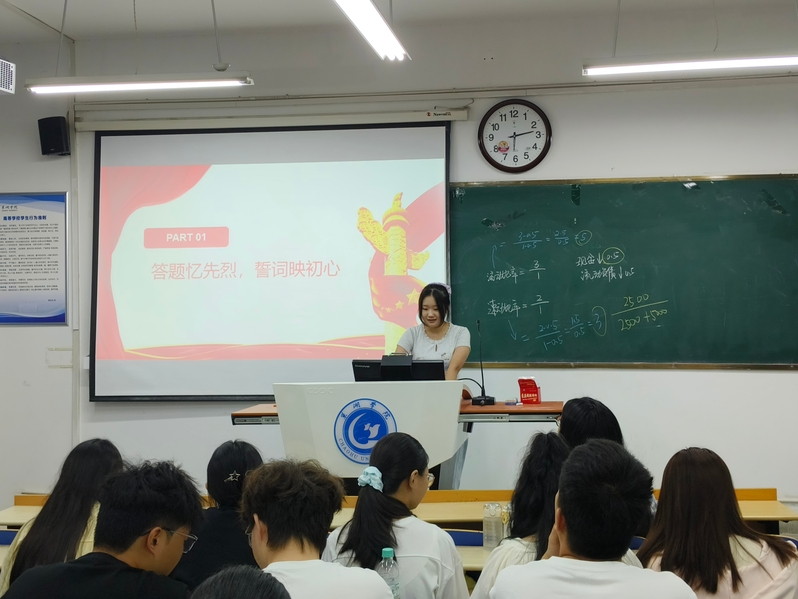 首先,周璇表明今年是纪念中国人民抗日战争暨世界反法西斯战争胜利80周年,是铭记历史、缅怀先烈、珍视和平、开创未来的重要节点。接着,周璇在PPT上放映李克农事迹问答,同学们竞相举手抢答,气氛热烈。周璇带领同学们学习李克农将军对党绝对忠诚、甘当无名英雄、关键时刻敢于牺牲、用智慧守护核心的英雄精神。随后,周璇讲述彭德怀在百团大战中亲赴前线、切断日军补给线的英勇事迹,并播放珍贵历史照片。同时,周璇鼓励同学们积极参加手抄报活动,用“笔尖上的抗战”重温烽火岁月,把敬仰化为强国动力。最后,周璇希望同学们深刻领悟伟大抗战精神中蕴含的爱国情怀、民族气节和英雄气概,珍惜时光,学好本领,能够担当民族复兴的重任。