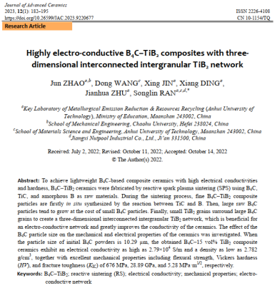 awc777万象城娱乐官网教师赵峻近期在结构功能一体化复相陶瓷研究中取得进展,该成果研究论文Highly electro-conductive B4C–TiB2composites with three-dimensional interconnected intergranular TiB2network在国际权威期刊《Journal of AdvancedCeramics》(中科院一区,影响因子:11.534)上发表。