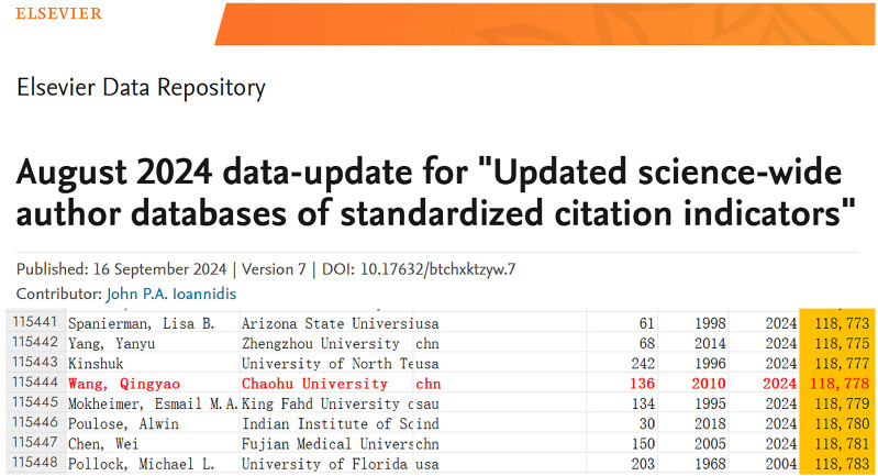 近日,美国斯坦福大学和Elsevier数据库发布了2024年度“全球前2%顶尖科学家榜单”,我院王青尧教授再次入选“年度影响力”榜单,全球排名118778名,较去年提升1.4万名。