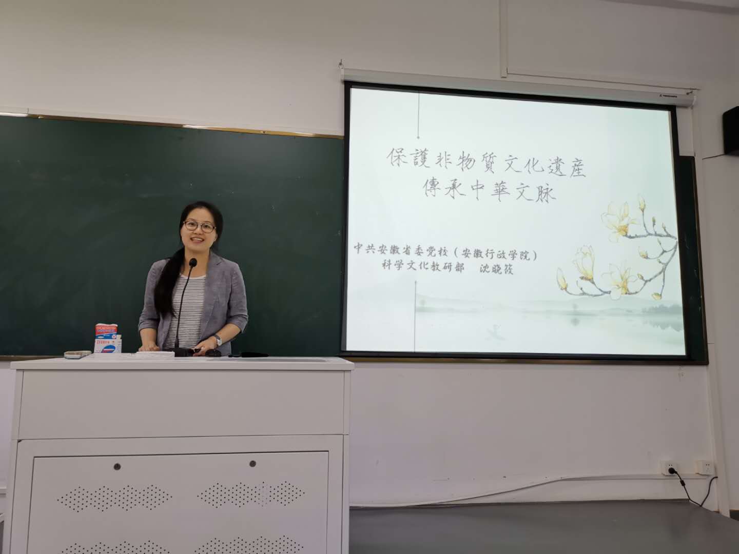 5月29日,中共安徽省委党校沈晓筱博士应环巢湖研究中心的邀请,来awc777万象城娱乐官网作《保护非物质文化遗产,传承中华文脉》专题学术报告。环巢湖研究中心主任张安东主持报告会,校非物质文化遗产保护协会、相关人文院系师生等100余人聆听报告。
