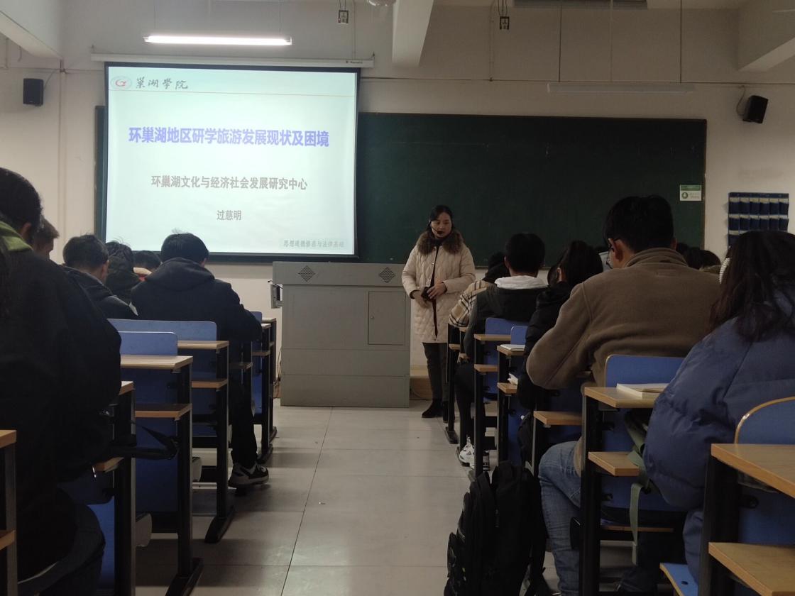 12月4日下午,环巢湖研究中心兼职研究员过慈明副教授在慎思楼中501教室举办了“环巢湖地区研学旅游发展现状及困境”的学术讲座。旅游管理学院2019级旅游管理专业的学生聆听了本次讲座。