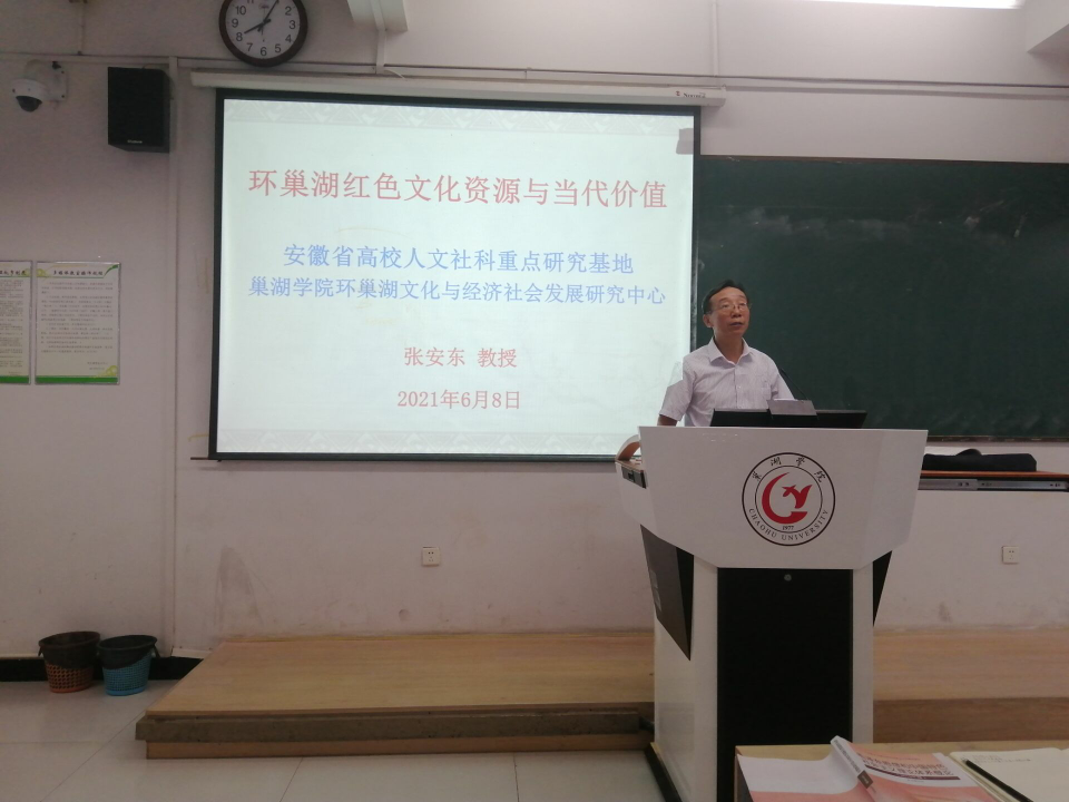 为庆祝中国共产党成立100周年,深入开展党史学习教育,加强大学生爱党爱国理想信念教育,环巢湖研究中心主任张安东教授于2021年6月18日在慎思楼中204教室为学校2019级部分学生120多人作了一场题为《环巢湖红色文化资源与当代价值》专题讲座。