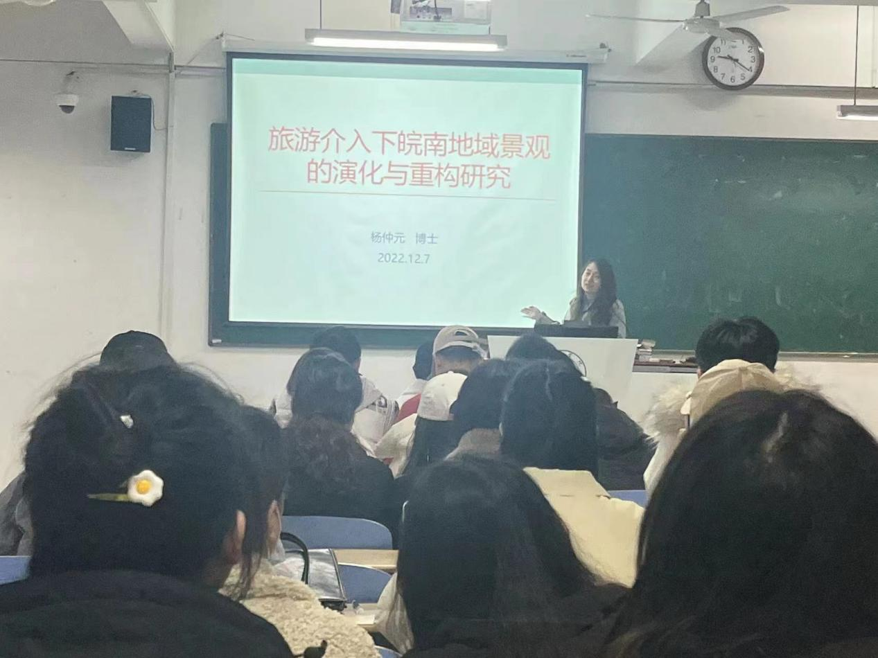 环巢湖中心研究员杨仲元博士于12月7日在慎思楼中301教室举办了题为“旅游介入下皖南地域景观的演化与重构研究”的学术讲座。旅游管理学院2022级部分学生聆听了本次讲座。