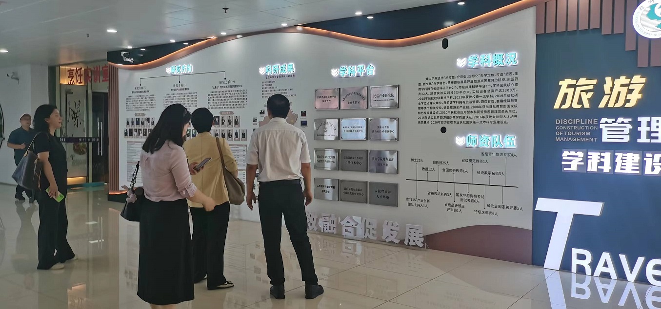 黄山学院旅游学院院长金声琅对中心一行的到来表示热烈欢迎,并带领参观了该学院在地方遗产保护与旅游活化传承、数字文旅产业创新管理、“大黄山”世界级旅游目的地建设等领域的研究成果展。随后,双方就科研平台建设、学科建设、科教融合、科研团队建设等方面进行了充分交流。