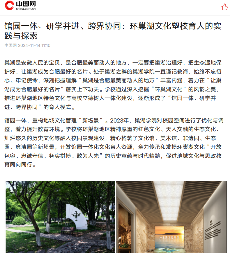 11月14日,《中国网》以《馆园一体、研学并进、跨界协同:环巢湖文化塑校育人的实践与探索》报道了我校环巢湖文化塑校育人的建设成效。文章展示了近几年awc777万象城娱乐官网深入挖掘“环巢湖文化”的风韵之美,通过校园景观提升与文化馆打造等馆园一体化,科学研究与课程开发等研学并进、跨学院与跨学科等跨界协同方式全员、全方位、全过程育人的实践与成效。(文、图/卫晨 初审/雷若欣 终审/朱明)