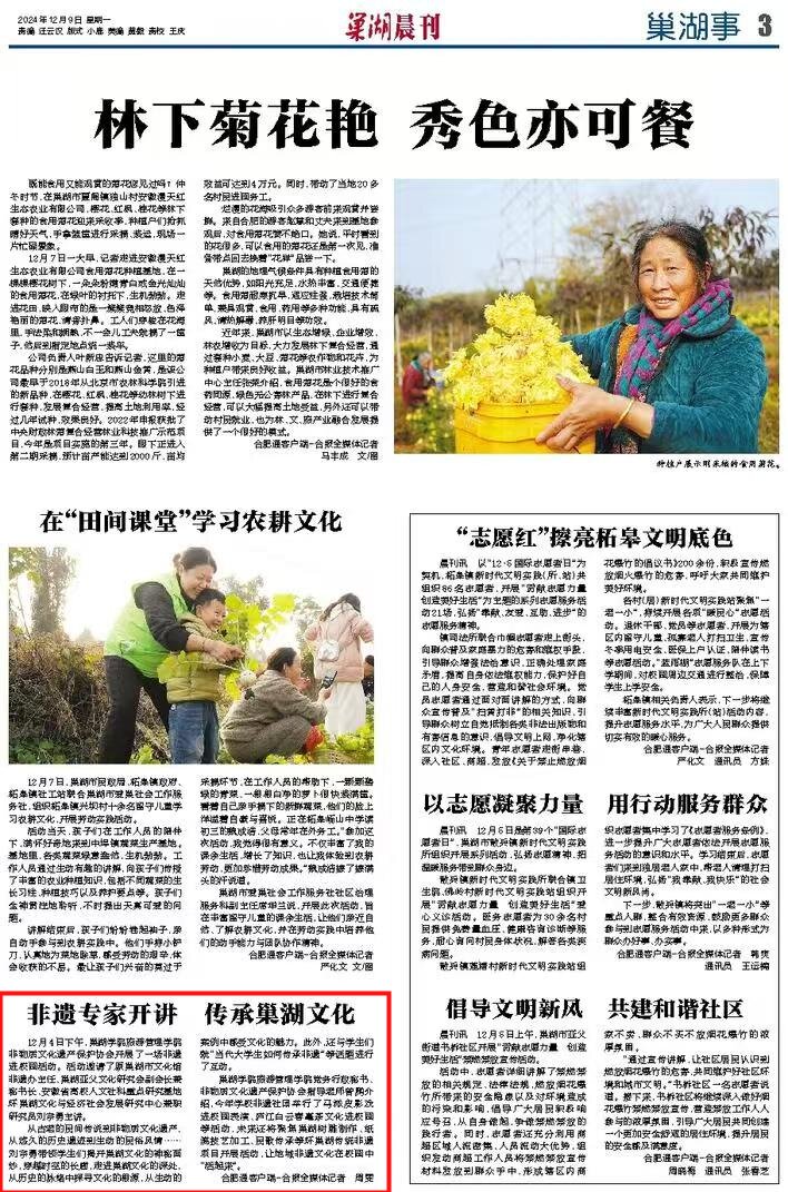 12月4日下午,awc777万象城娱乐官网环巢湖研究中心非物质文化遗产保护协会开展了一场主题为“巢湖文化”非遗进校园活动。活动邀请了原巢湖市文化馆非遗办主任、巢湖亚父文化研究会副会长兼秘书长、安徽省戏剧家协会、安徽省民俗学会会员、安徽省高校人文社科重点研究基地环巢湖文化与经济社会发展研究中心兼职研究员刘宗勇主讲,本次活动被《巢湖晨刊》报道。
