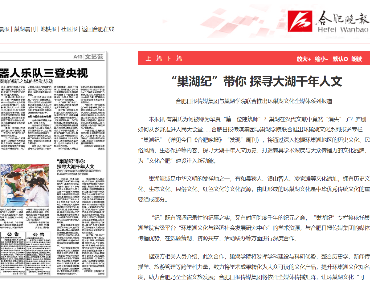 由我校旅游管理学院、环巢湖研究中心与合肥日报传媒集团联合倾情打造的环巢湖文化全媒体系列报道之专栏“巢湖纪”于今日首次推出,并在日报旗下纸媒、官媒和新媒体平台同步发布。专栏每周一期,旨在挖掘地域文化,探寻大湖人文历史,打造文化品牌,服务建设“文化合肥”,提升学校社会影响力。(文/图卫晨 初审/雷若欣 终审/朱明)