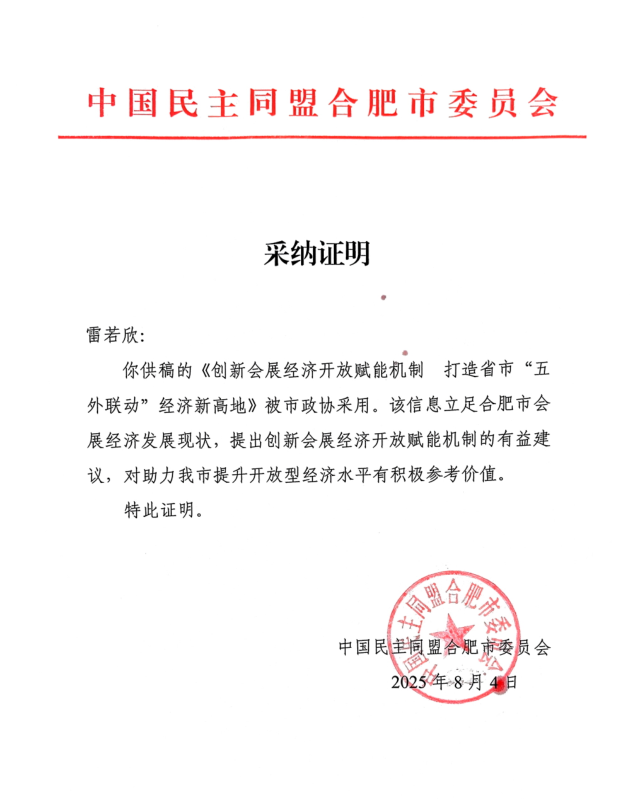 近期,环巢湖研究中心雷若欣团队完成的《创新会展经济开放赋能机制 打造省市“五外联动”经济新高地》被合肥市政协采用。该信息立足合肥市会展经济发展现状,提出了以国际化认证与品牌塑造破解能级不足困境、以全链条协同机制提升“五外”资源转化效能、以数字基建与制度创新打通跨境服务堵点、以专业化生态构建强化产业支撑能力等策略与措施,对助力合肥市提升开放型经济水平有积极参考价值。(文/曾鹏 图/民盟合肥市委 初审/雷若欣 终审/朱明)
