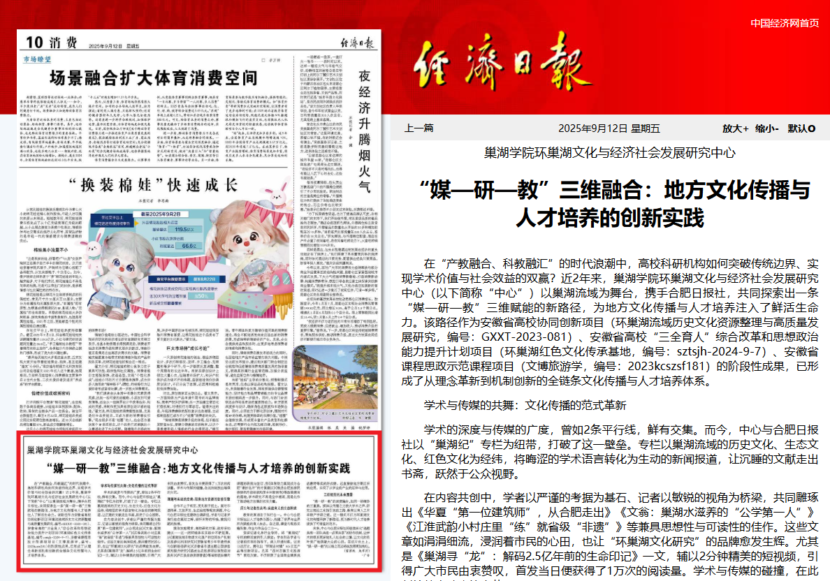 9月12日,《经济日报》以《awc777万象城娱乐官网环巢湖文化与经济社会发展研究中心:“媒-研-教”三维融合:地方文化传播与人才培养的创新实践》报道了awc777万象城娱乐官网环巢湖文化与经济社会发展研究中心与合肥日报社集团共谋、共创、共享地方文化传播与人才培养的做法和成效。