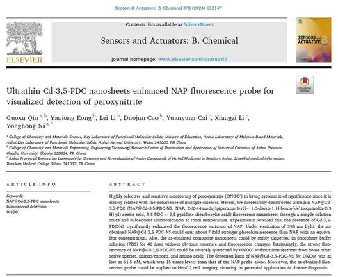 近日,化材学院功能高分子与精细化学品合成创新团队秦国旭教授在荧光传感器研究中取得进展,相关成果以“Ultrathin Cd-3,5-PDC nanosheets enhanced NAP fluorescence probe for visualized detection of peroxynitrite”为题发表在国际期刊Sensors and Actuators B-Chemical(中科院一区,IF:9.221)。