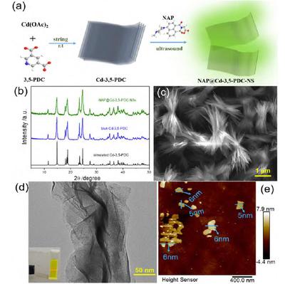 过氧亚硝酸根(ONOO-)与关节炎、糖尿病、癌症、心血管疾病及神经退行性疾病等疾病密切相关。而实现体内ONOO- 的浓度及其在体内分布情况的实时监测对相关病症的早期诊断及治疗具有重要参考意义。秦国旭教授科研团队通过简单的室温溶液路线和超声的方法成功制备厚度仅5-6 nm的超薄NAP@Cd-3,5-PDC纳米片。研究发现,与等浓度的小分子NAP荧光探针相比,获得的NAP@Cd-3,5-PDC纳米片的荧光强度增强了约7倍,且可以稳定地分散在PBS缓冲液中42天而没有明显的结构坍塌和荧光淬灭。在有其他活性物种、阴阳离子和氨基酸干扰的情况下,ONOO-可以非常敏感且高选择性地快速淬灭NAP@Cd-3,5-PDC-NS的荧光。NAP@Cd-3,5-PDC-NS对ONOO-的检测限低至61.5 nM,这个结果要比单独NAP探针的检测限低15倍。质谱结果和DFT计算证实,获得的纳米片对ONOO-的高选择性检测是由于分子内电荷转移效应被阻断。此外,具有低细胞毒性的NAP@Cd-3,5-PDC-NS被成功应用于HepG2细胞成像,显示其在疾病诊断中的潜在应用。