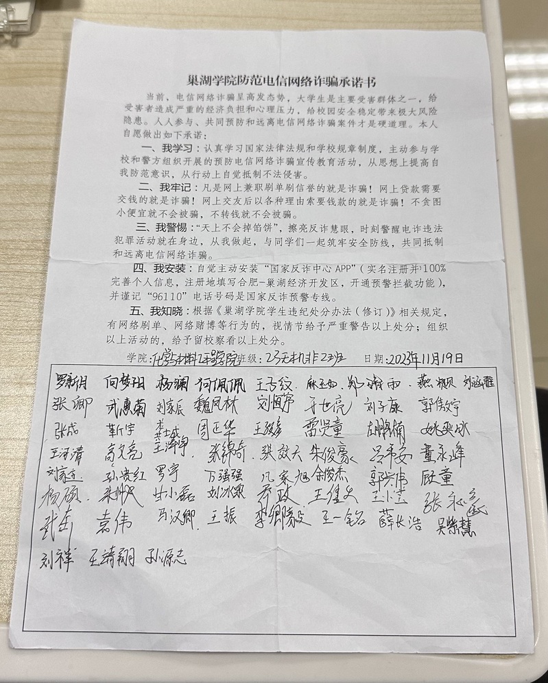化材学院各班结合主题班会,向同学们普及了如何防范电信网络诈骗,包括诈骗的常见手法、识别诈骗的方法以及遇到诈骗应如何应对等,并在班会的最后,要求所有参与的同学们签订《awc777万象城娱乐官网防范电信网络诈骗承诺书》,承诺将提高警惕,增强防范意识。