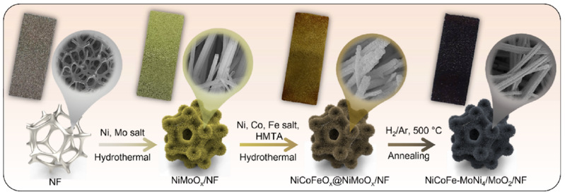 其优异的催化性能主要源自催化剂独特的一维(1D)纳米结构和NiCoFe配合物与MoNi4/MoO2框架之间的协同相互作用增强了传质,暴露了额外的活性位点,增强了内在活性。此外,将Co和Fe加入三元配合物中,大大提高了HER和OER的催化效率,为开发高性能、低成本的双功能电催化剂和促进可持续能源转换技术的进步提供了一条有效的途径。