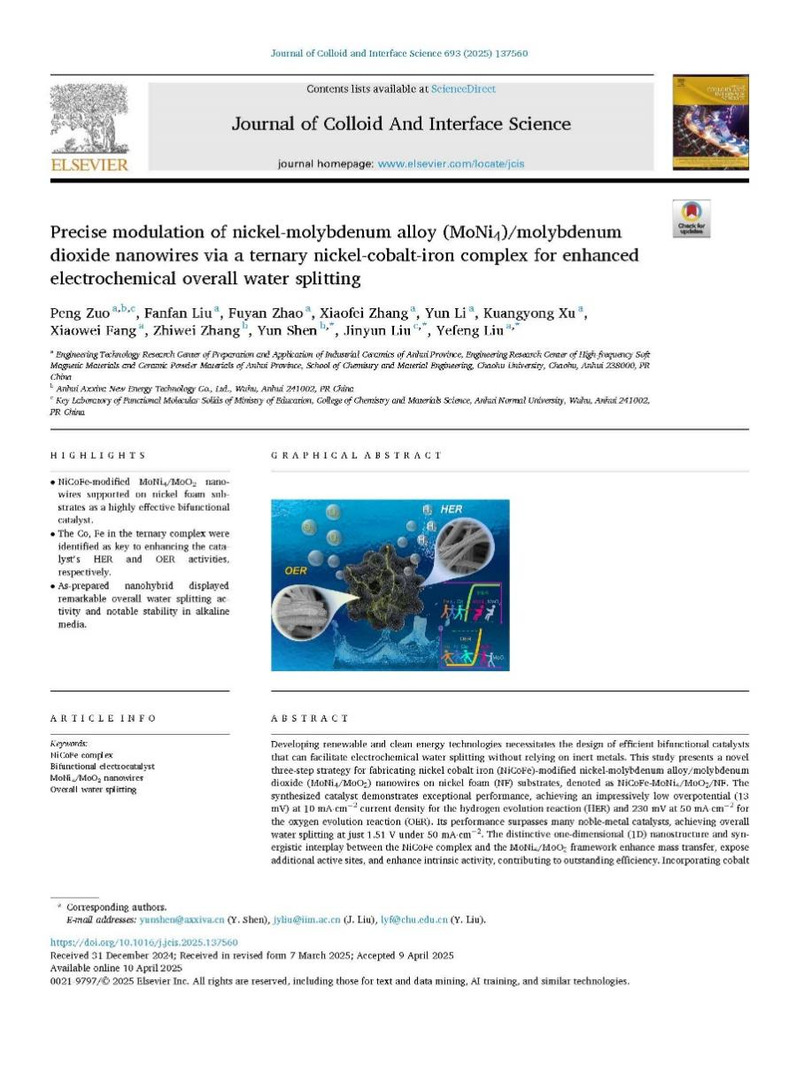 近日,我院新能源材料与器件科研创新团队左鹏博士在开发高性能双功能电解水催化剂研究中取得进展,相关成果以“Precise modulation of nickel-molybdenum alloy (MoNi4)/molybdenum dioxide nanowires via a ternary nickel-cobalt-iron complex for enhanced electrochemical overall water splitting”为题发表在国际权威期刊《Journal of Colloid and Interface Science》(中国科学院1区,IF:9.7)。