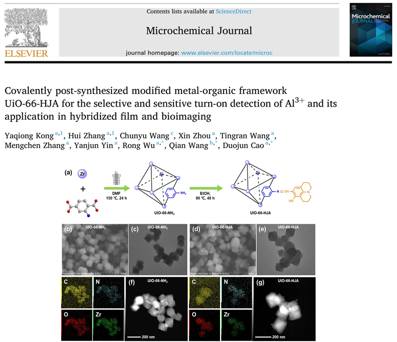 该工作利用希夫碱反应,通过共价后合成修饰(CPSM)策略构建出新型金属有机框架(MOF)荧光传感器—UIO-66-HJA。该材料对Al3+识别具有灵敏度高、选择性好、生物成像优异等特点。此外,研究者进一步将UIO-66-HJA与PVA复合,制备出柔性、可折叠的荧光薄膜,实现了对实际水样中Al3+的现场、可视化检测。这项研究展示了MOF后修饰策略在构建高性能传感平台方面的强大能力,为开发用于环境和生物医学检测的多功能器件提供了新思路。研究成果发表在“Microchemical Journal, 2025, 216, 114569”。文章第一作者为我校孔亚琼博士,我校本科生张慧同学为共同第一作者。通讯作者为我校曹多军与吴蓉老师,以及吉林大学中日联合医院王茜博士。