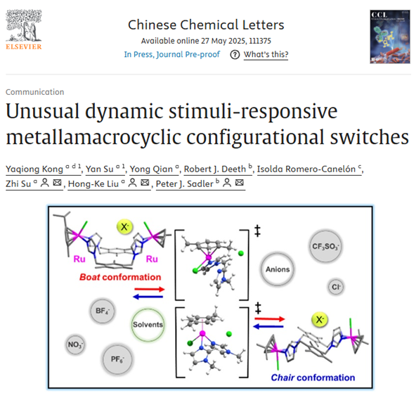 该工作设计合成了系列金属大环化合物,通过单晶衍射,研究人员观察到该大环具有多种不同的构象异构体,包括椅式、船式和扭船式。这些构型在溶液中能够缓慢转变,而阴离子种类对这一转变过程起关键调控作用。该工作首次揭示了此类金属大环的动态构型变化机制,为药物载体、开发智能分子器件和新型催化剂提供了新思路。研究成果发表在“Chinese Chemical Letters, 2025, 111375,https://doi.org/10.1016/j.cclet.2025.111375”。文章第一作者为我校孔亚琼博士,南京师范大学苏岩博士为共同第一作者,通讯作者为南京师范大学的刘红科教授与苏志教授,以及英国皇家学会院士、华威大学Peter J. Sadler教授。