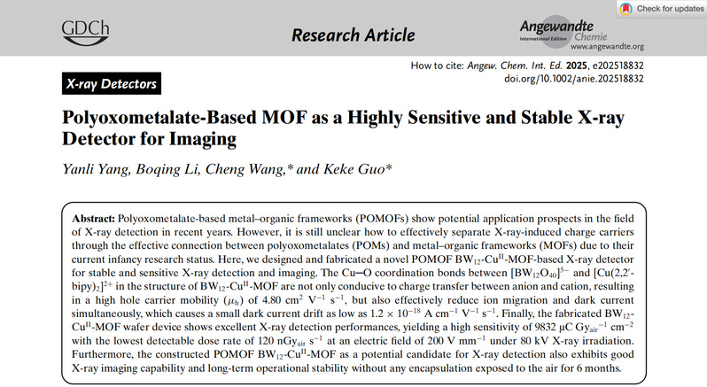 近日,我校化学与材料工程学院王成博士与西北师范大学化学化工学院郭柯柯副教授合作,在多金属氧酸盐基金属有机框架(POMOF)材料构建高灵敏度、高稳定性X射线探测器研究中取得重要突破,相关成果发表于国际化学领域顶级期刊《Angewandte Chemie International Edition》。我校作为论文通讯单位,王成博士为共同通讯作者,这也是我校首次以通讯单位在该期刊发表论文,标志着我校在功能材料与光电探测领域的研究水平获得国际认可,对提升学校在材料与化工领域的学术影响力具有重要意义。