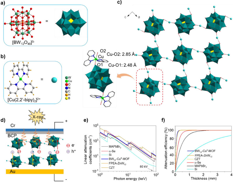 X射线探测器在医疗诊断、工业无损检测等领域具有广泛应用。传统探测器材料(如非晶硒,碲锌镉)存在制备成本高、难加工等问题。近年来,金属-有机框架(MOFs)和多酸(POMs)材料在X射线探测领域崭露头角,但MOFs对X射线吸收能力较差,导致灵敏度较低;虽然POMs具有较强的X射线吸收能力,但独立的多酸簇导致较低的电荷转移效率,且POMs表面易移动的抗衡阳离子,影响了器件的稳定性和信噪比。因此,将MOFs和POMs有效地结合,构筑POMOFs材料,有望提升X射线探测的灵敏度并增强其长期运行稳定性。基于此,合作团队设计并合成了一种新型POMOF材料——BW12-Cu2+-MOF,通过Cu-O配位键实现了高效的电荷转移与离子迁移抑制,显著提升了器件的灵敏度与稳定性。