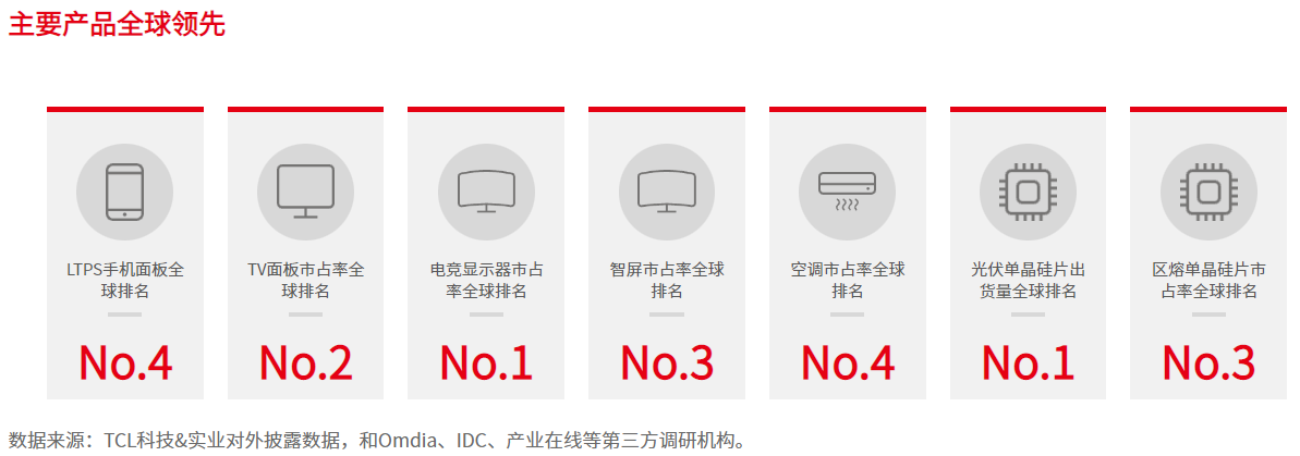 TCL成立于1981年,经过四十余年的发展,已形成TCL科技和TCL实业两大产业集团,TCL科技聚焦半导体显示、半导体光伏及半导体材料产业,以产业金融与投资平台支持主业发展,加速向技术、资本密集型的高科技产业集团转型。TCL实业聚焦智能终端产品及服务,旨在以全品类智慧科技产品服务全球用户。