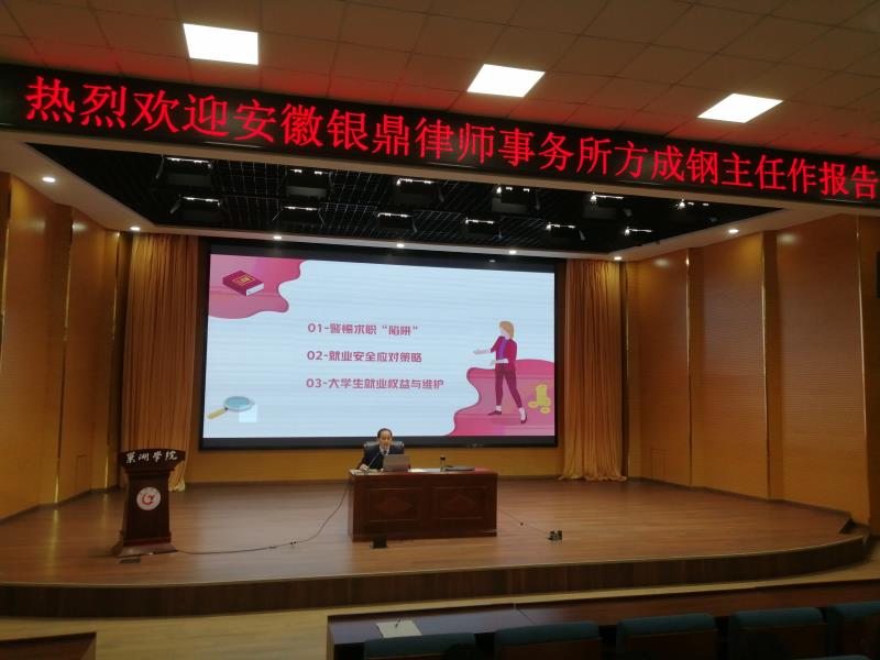 3月17日下午,应经济与法学学院、科研处的邀请,安徽银鼎律师事务所方成钢主任来校举办题为“大学生就业相关安全与法律”的专题讲座。讲座由经济与法学学院施玮副院长主持,100多名师生聆听了讲座。
