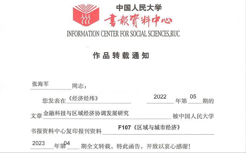 近日,我校经济与法学学院张海军博士发表的论文《金融科技与区域经济协调发展研究》,被中国人民大学复印报刊资料《区域与城市经济》2023年第4期全文转载,该论文原发表于中文社会科学引文索引(CSSCI)来源期刊《经济经纬》2022年第5期。