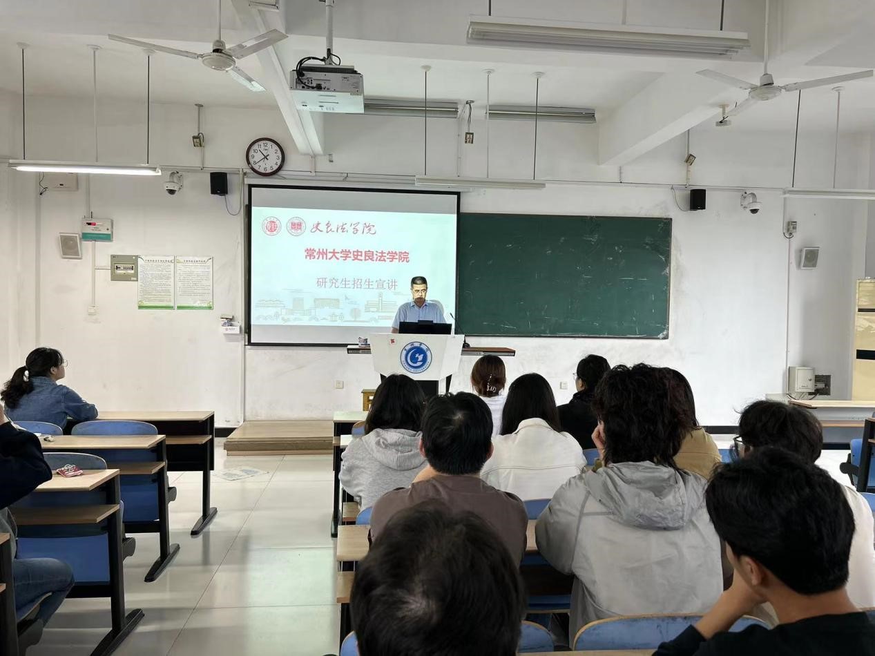 座谈会结束后,夏纪森为经法学院21级法学专业本科生做了常州大学史良法学院研究生招生宣讲。夏纪森就史良法学院发展历程、科研创新等方面进行了总体介绍,并着重讲解了备受考研学子关注的人才培养、报考人数等方面的基本情况,并真诚欢迎同学们报考常州大学研究生。