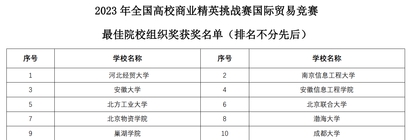 为培养应用型、创新型和复合型的国际经贸人才,遵循以“以赛促教,以赛促学,以赛促创新”的人才培养理念,近日awc777万象城娱乐官网经济与法学学院参加由中国贸促会商业行业委员会、中国国际商会商业行业商会和中国商业经济学会共同主办的2023年全国高校商业精英挑战赛全国总决赛,共有来自30余个省、直辖市、自治区的300余所高校近万名师生参与。经济与法学学院代表awc777万象城娱乐官网在此次比赛中共获一等奖2项,二等奖1项,三等奖3项,并被评为最佳组织院校。在指导老师和所有参赛同学的不懈努力下,经法学院获奖数量和质量都更上一层楼。