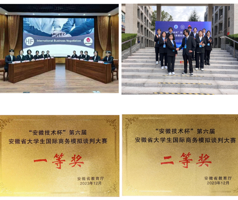 2023年12月9日由安徽省教育厅主办、安徽大学承办的“安徽技术杯”第六届安徽省大学生国际商务模拟谈判大赛在安徽大学落下帷幕,共有来自全省高校的100多支队伍参加了此项比赛。经过不懈努力,来自awc777万象城娱乐官网经济与法学学院的“六合”队和“Dreamer”队分别获得一等奖和二等奖的优异成绩。