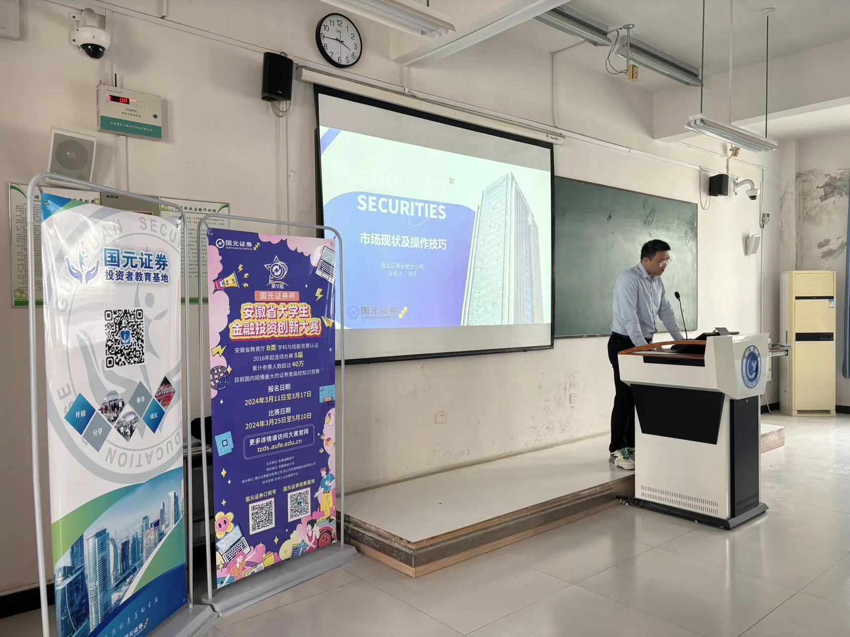 2024年4月24日下午,经法学院邀请到国元证券合肥分公司投资顾问刘洋为参加2024年安徽省大学生金融投资创新大赛的同学们举行了一场精彩的讲座,旨在帮助参赛者提升金融投资素养和实战能力,能在比赛中取得更优异的成绩。2022级金融工程专业学生聆听了本次讲座。讲座的主题是市场现状及操作技巧。