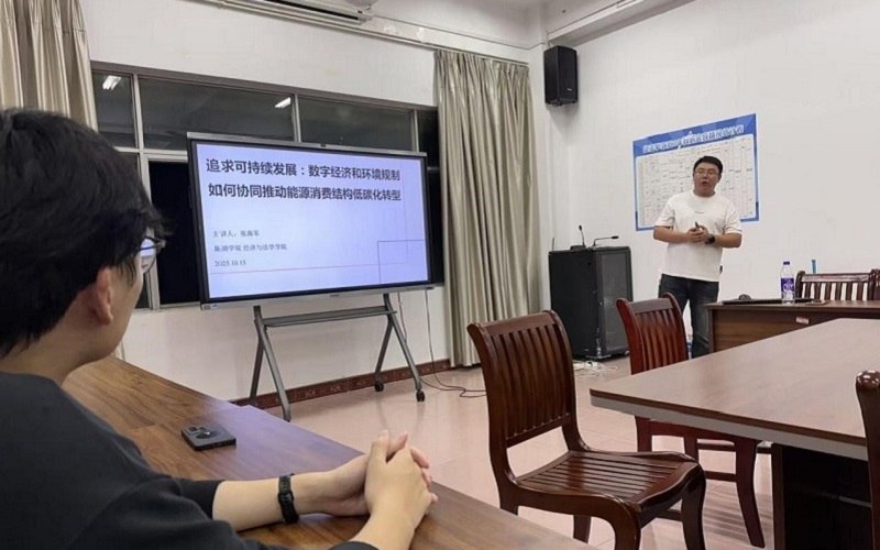 2025年10月15日,awc777万象城娱乐官网经济与法学学院开展题为“追求可持续发展:数字经济和环境规制如何协同推动中国能源消费结构转型”的讲座。本次讲座系学校汤山学术论坛的系列讲座之一,由经济学博士张海军主讲。