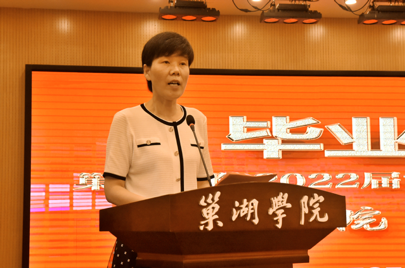 张莉校长在毕业典礼上致辞,她代表学校向富煌教学班圆满完成学业的全体毕业生表示祝贺,向悉心培育的老师们致以感谢,同时也感谢富煌集团公司为学校提供良好的教科研平台。她在致辞中说多年来富煌集团公司与我校在人才培养、科学研究、就业创业上建立了良好的联动机制,尤其是在产学研合作基地、实习就业一体化建设、继续教育办学等方面合作成果丰硕。学历继续教育富煌教学班的成功举办就是双方实质性合作的重要成果之一。千淘万漉虽辛苦,吹尽狂沙始到金。同学们即将踏上新的人生征途之际,张校长提出殷切希望:一是希望大家在自己的平凡的岗位上埋头实干,兢兢业业,恪尽职守。在企业发展中,干一行、爱一行、精一行、成一行,成为一名公司优秀的建设者。二是希望大家树牢终身学习的理念,潜心学习,在实践中探索新知,并将其转化为服务企业的实践能力,在企业的改革创新中勇立潮头,助力企业发展和壮大。三是希望大家勇于担当,要自觉把个人命运与企业命运紧紧结合在一起,学以致用,努力成为高素质、高层次的企业创新型人才,以优异成绩回报公司、回报社会。