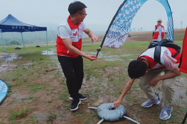 比赛当日早上7:30,志愿者们兵分两路前往参赛队员集合点及比赛场地。虽天气情况恶劣,但当参赛队员们到达比赛场地时,志愿者们早已迎着风雨等候在各个路口处。在将参赛队员们接到各自的比赛场地后,志愿者们便在比赛场地上忙碌了起来。当日风雨交加,比赛场地变得泥泞不堪,赛场道具也因风力过大被吹的东倒西歪。尽管如此,志愿者们还是坚守自己的职责,不断在风雨中扶起被吹到的道具以及维护赛场的秩序。整场赛事在志愿者们的助力下井然有序地的进行着。