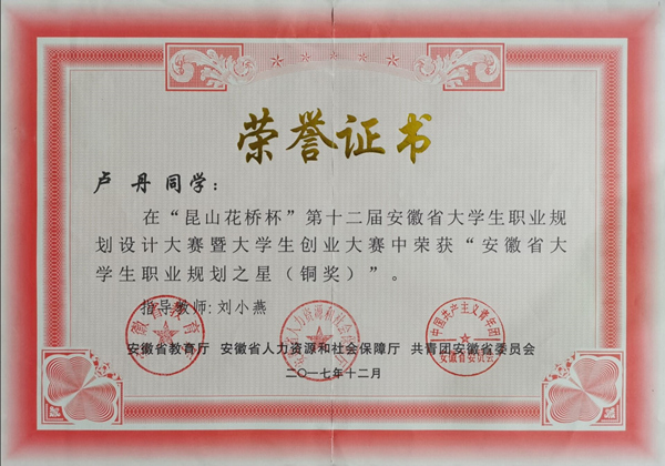 卢丹,女,汉族,1998年生,共青团员,安庆市人,信息工程学院2016级软件工程2班学生。先后获得“蓝桥杯”全国软件和信息技术专业人才大赛省级二等奖、“数创杯”全国大学生数学建模挑战赛优秀奖、安徽省大学生职业生涯规划设计大赛铜奖、安徽省百所高校百万大学生科普创意创新大赛优秀奖。在校期间多次获得专业一等奖学金,先后通过英语四级、六级考试,辅修财务管理专业并获得第二学位。被评为awc777万象城娱乐官网三好学生。在2020年研究生入学考试中,考入合肥工业大学计算机系电子信息专业。