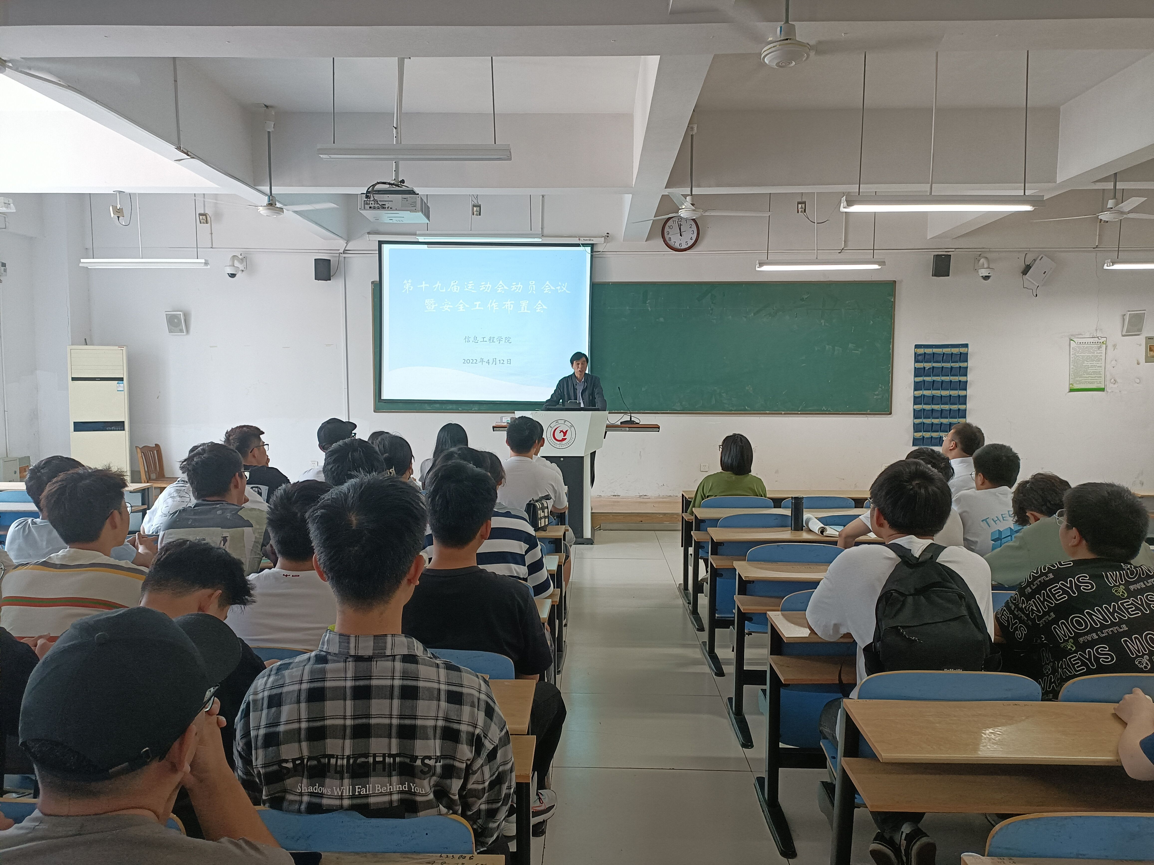 “弘扬运动之风气,展现青春之美丽”。为确保第十九届运动会顺利进行,加强参赛选手的安全意识,信息工程学院于4月12日12:00在慎思楼中101教室召开第十九届运动会动员会暨安全工作布置会。院党委书记郑尚志、团总支书记刘小燕、团总支副书记姜飞、院学生会全体工作人员及全体运动员参会。