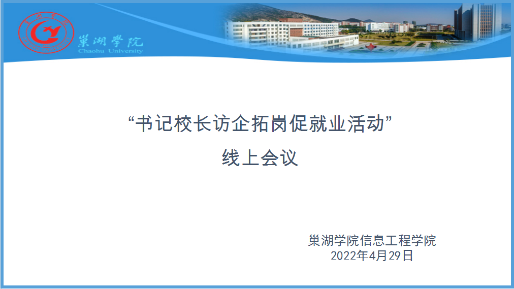 为贯彻落实教育部关于“高校书记校长访企拓岗就业专项行动”的工作要求,推动落实就业工作“一把手”工程,助力毕业生高质量就业,信息工程学院于4月29日上午在院会议室开展访企拓岗促就业专项活动,校党委委员、信息学院党委书记郑尚志和副院长吴其林、院党委副书记童先军、党务行政秘书许航、教学科研秘书张小伟、毕业班辅导员出席会议。