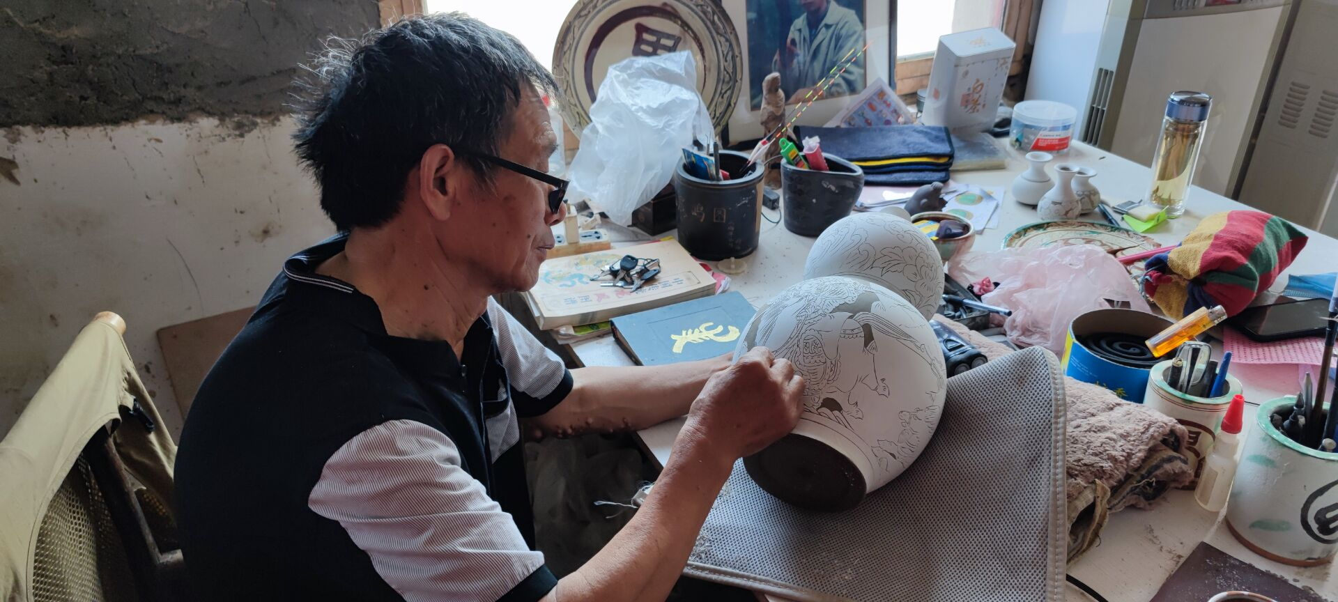 随后团队成员前往陶艺公园,拜访了界首彩陶传承家族之一的卢氏卢群海大师。此时卢先生正细心的对彩陶进行刻花工作