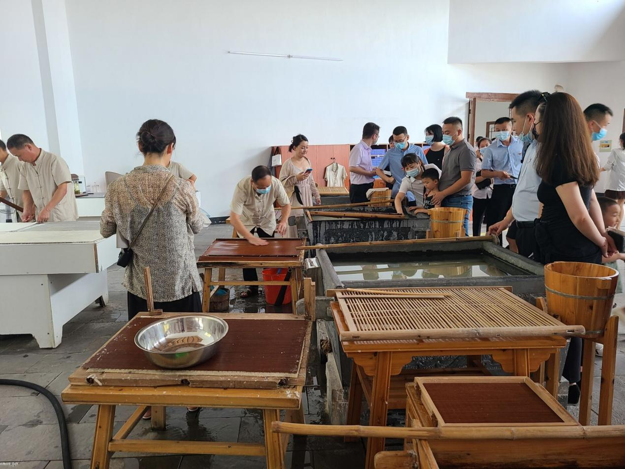 队员们在讲解员的引领下进入宣纸展览馆中进行参观,初步了解到宣纸的历史、发展现状和制作工序等,作为原产地域保护产品,宣纸对原材料和制作工艺要求十分苛刻。因此,泾县的地理条件、气候、水质,造就了泾县是宣纸制作的唯一产地。“轻似蝉冀白如雪,抖似细绸不闻声”百折不损、光而不滑,宜书宜画,不腐不蠹,一纸长寿千年,文书典籍、讲道经文、书画精品,大多赖此千古传存,这就是中国一绝—宣纸。随后进入二楼展览厅,为了保护珍贵书画作品,厅内禁止拍照,因此小分队队员们以脑代笔记录精彩作品,进一步感受到宣纸与艺术不可分割的依存关系。