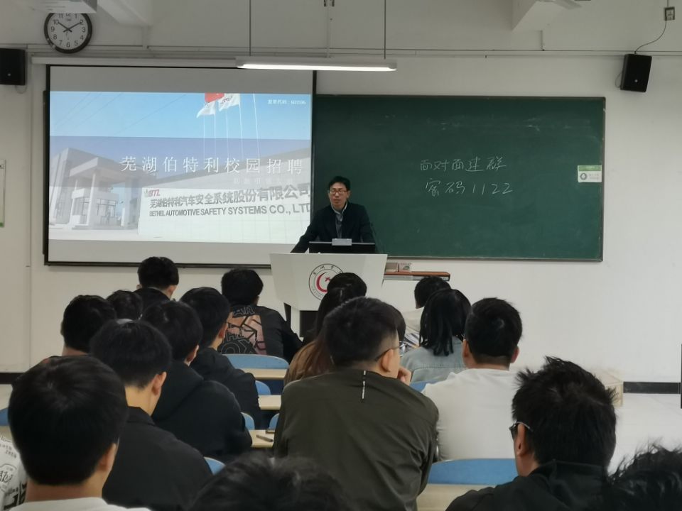 2021年10月26日上午,信息工程学院联合机械工程学院、电子工程学院在慎思楼北102教室举办就业招聘会,本次招聘会芜湖伯特利汽车安全系统股份有限公司电子配件部副总监汤德东主讲。