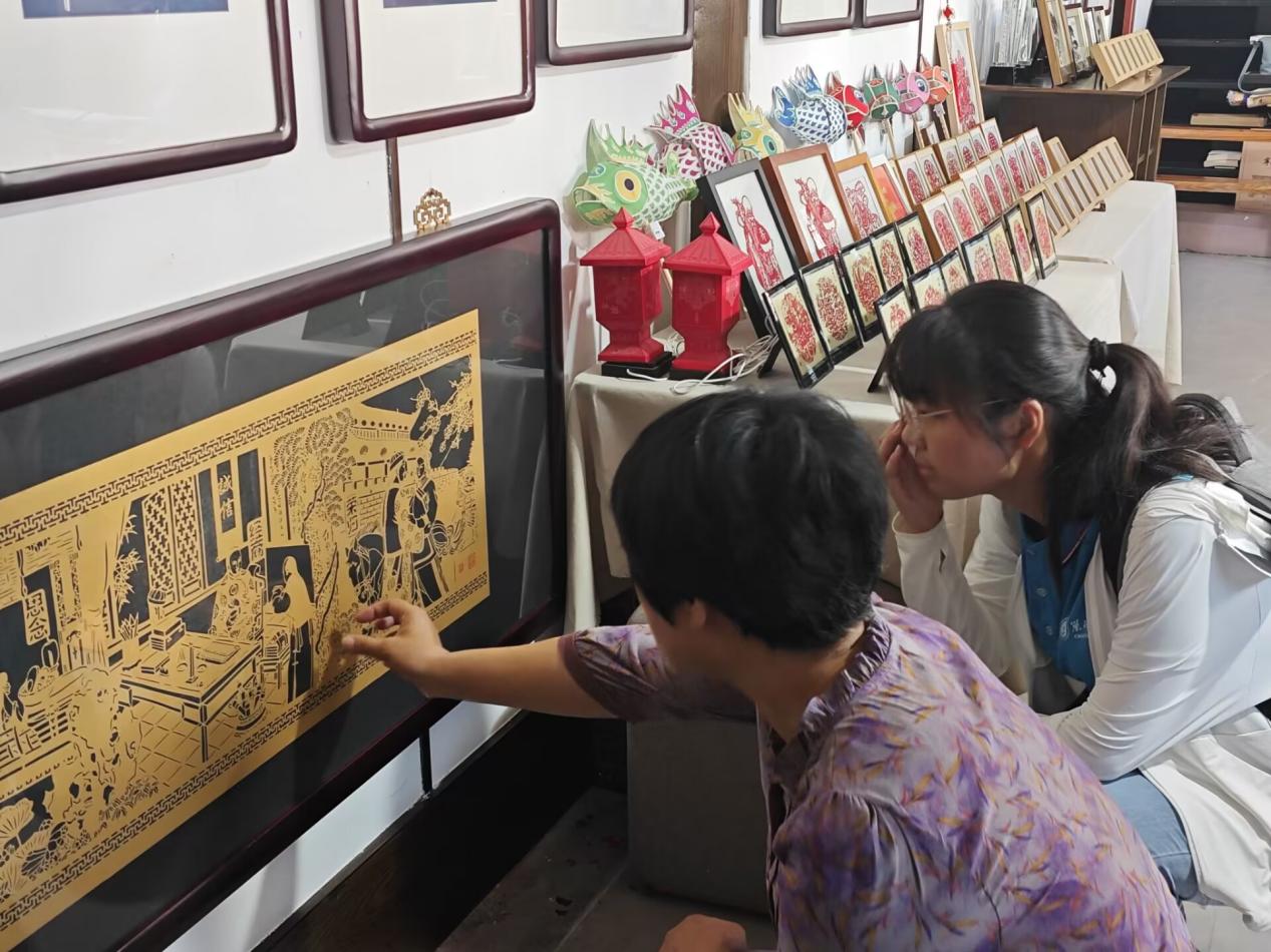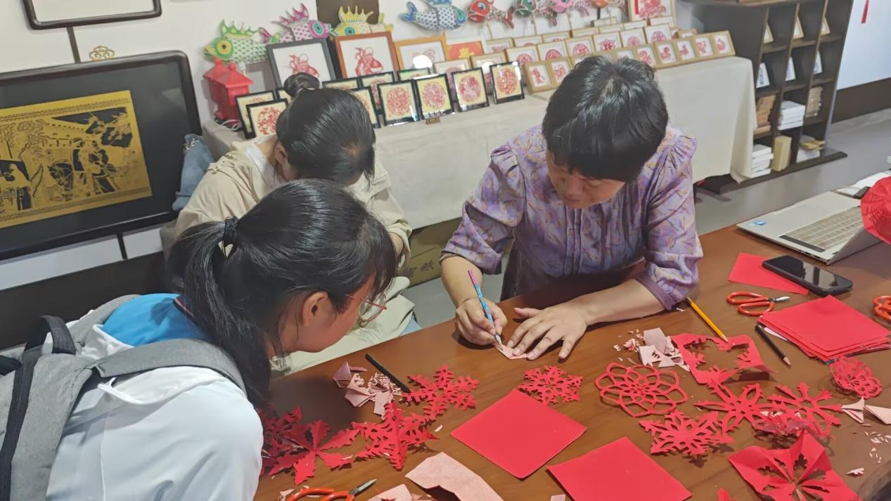 与非遗徽墨同样声名在外的,还有独具匠心的徽州剪纸。在徽州古城仁和楼的吴笑梅剪纸手作体验馆,实践成员们在省级非物质文化遗产“徽州剪纸”代表性传承人吴笑梅老师的指导下,上了一堂别开生面的非遗实践课。