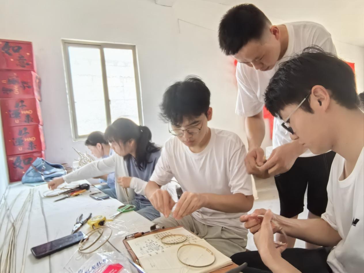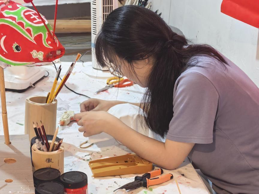 实践中,成员们亲身体验了鱼灯制作全流程:先用竹篾扎制骨架,在匠人指导下将竹条弯出鱼身弧度;随后糊上绵纸,指尖轻压使纸面平整服帖;最后调和颜料,为鱼灯绘上鳞片、鱼鳍,一笔一划勾勒出灵动神态。大家不禁感慨:“鱼灯的制作看起来容易,但是很多流程却需要耐下性子慢慢进行,对观察和实践能力都是不小的考验。”