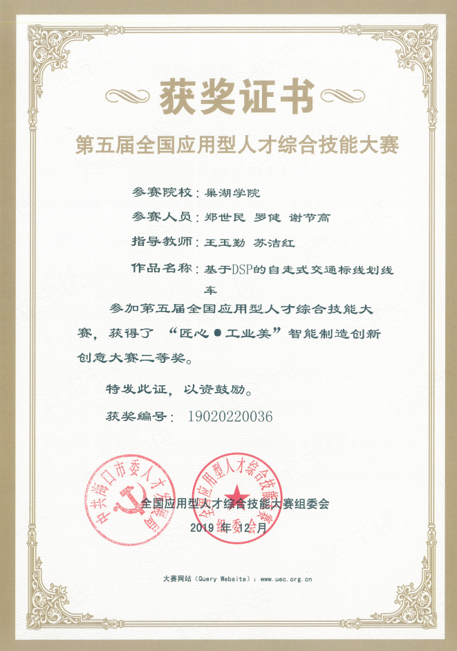 第五届全国应用型人才综合技能大赛二等奖——基于DSP的自走式交通标线划线车 2019.12