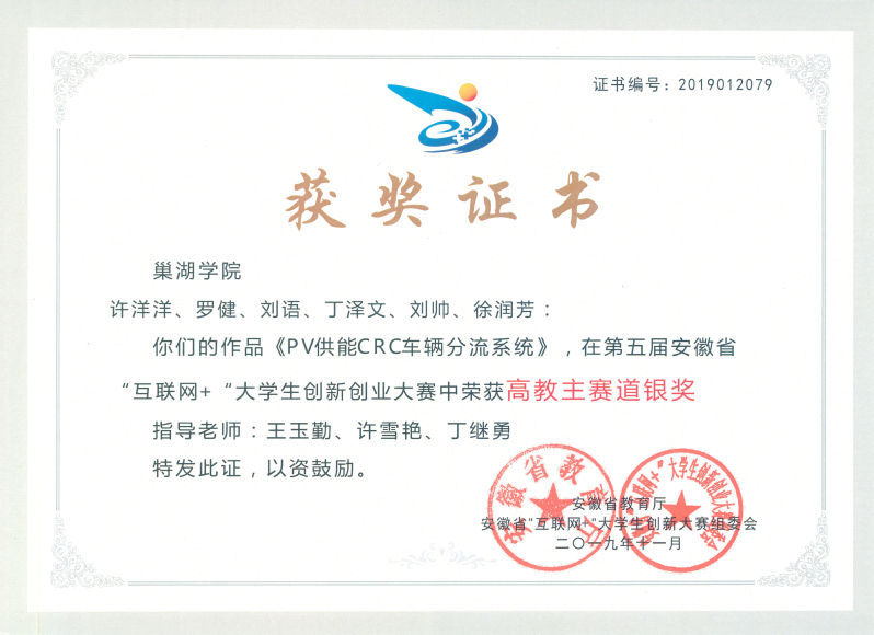 第五届中国“互联网 ”大学生创新创业大赛省银奖 2019.11