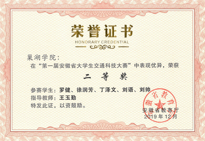 第一届安徽省大学生交通科技大赛省二等奖 2019.12